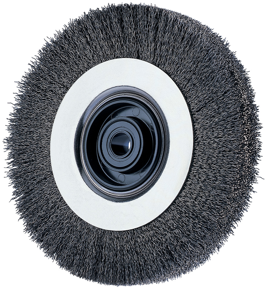 EZmount™ crimped wire wheel eliminates mounting problems commonly found with other bench brushes. It is designed with a flat side profile that matches all mounting flanges on pedestal and bench grinders for a correct fit. Easy installation takes seconds. The telescoping bushing is self-sizing and makes full width contact to prevent the brush from falling into spindle threads.