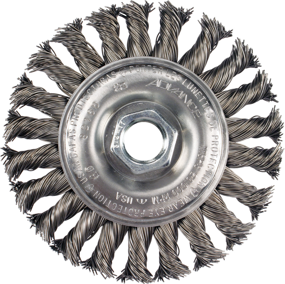 Full cable twist knotted wire is efficient for weld spatter removal, blending tool marks, cleaning and deburring, and removal of encrustations. Used in pipe joining for cleaning scale and spatter following welding. Low-flex, high-impact cleaning.