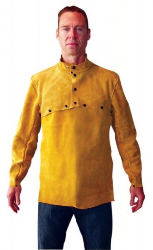 Bourbon brown premium side split cowhide cape sleeve with 20"" leather bib. Designed to protect shoulder, upper chest, and sleeves. Open back allows for ventilation. One soapstone pocket on each sleeve. Underarm gusset for easier movement. Sewn with Kevlar thread throughout. 20"" leather bib snaps securely to cape sleeve. Bib has rear adjustment buckle for easy on/off.